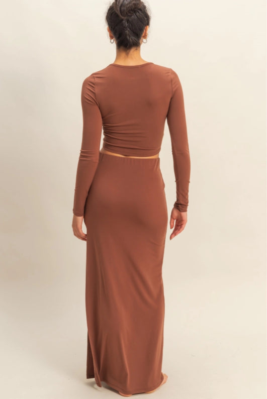 Long sleeve knit top features round neck, fitted style, and crop length. Matching skirt available in separate listing. Polyester/spandex blend.