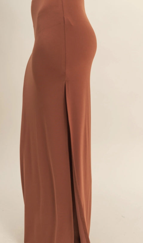 Knit maxi skirt features elastic waist, pull on style, and side slit. Polyester/spandex blend. Matching top available in separate listing.