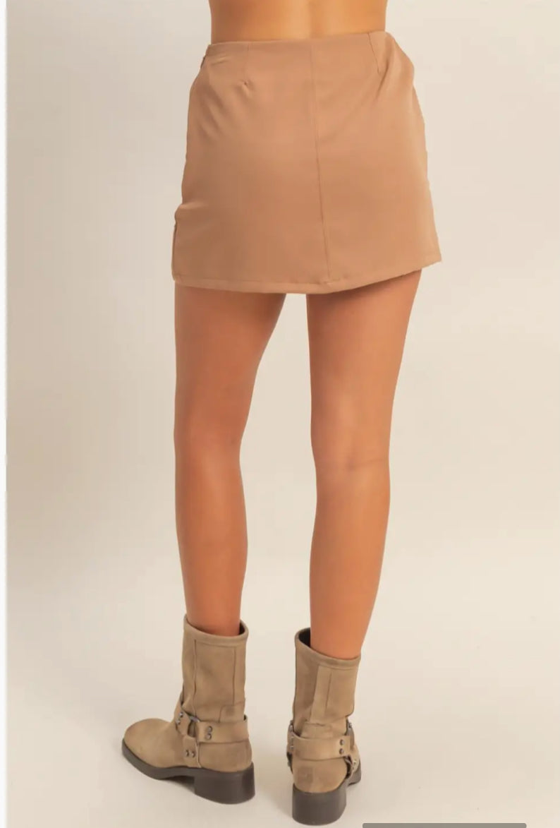 Taupe mini skirt features pull on style, body hugging fit and small front slit. Polyester/spandex blend.