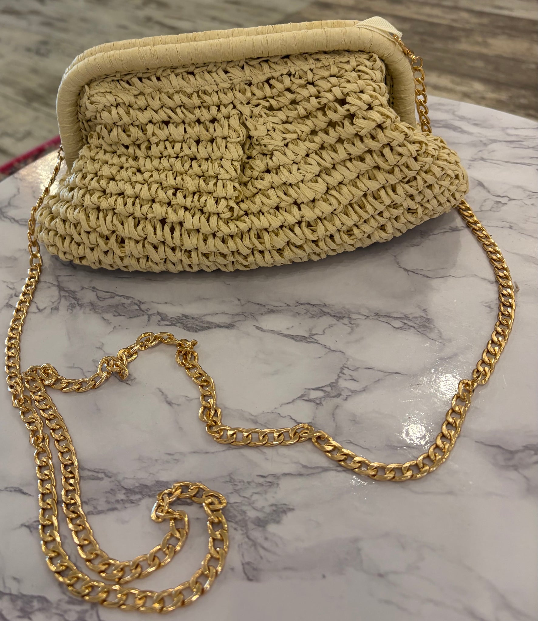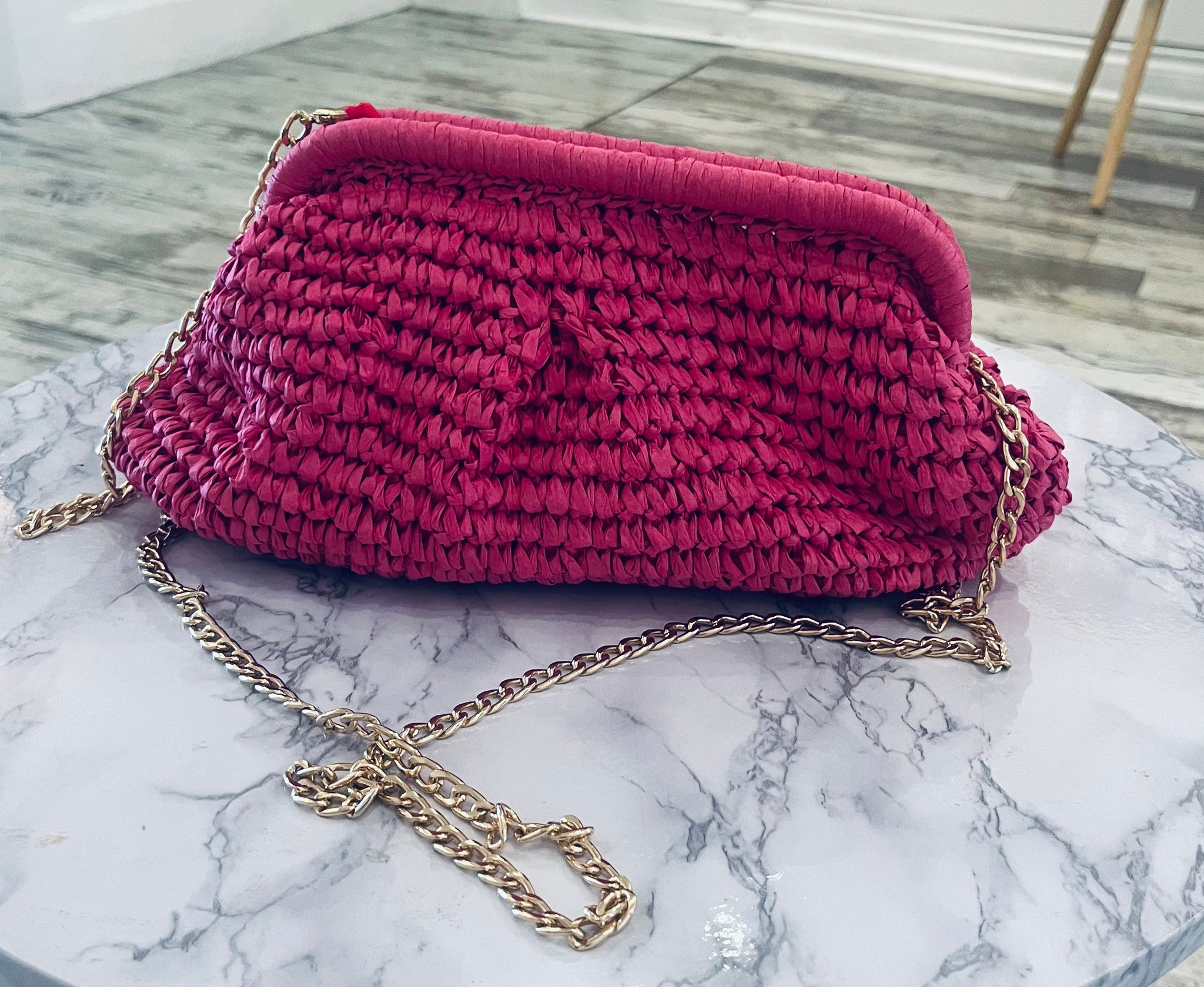 Natural or Pink raffia straw clutch purse features removable gold long strap, inside pocket and lined interior. Measures 11” L x 6” H