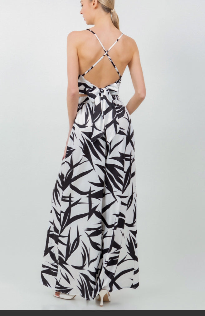 Black and white print tank features adjustable back straps, self back tie, cross cross front and crop length. 100% polyester. Matching pants available in separate listing