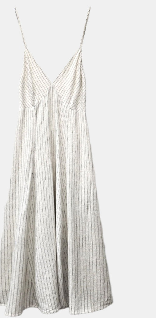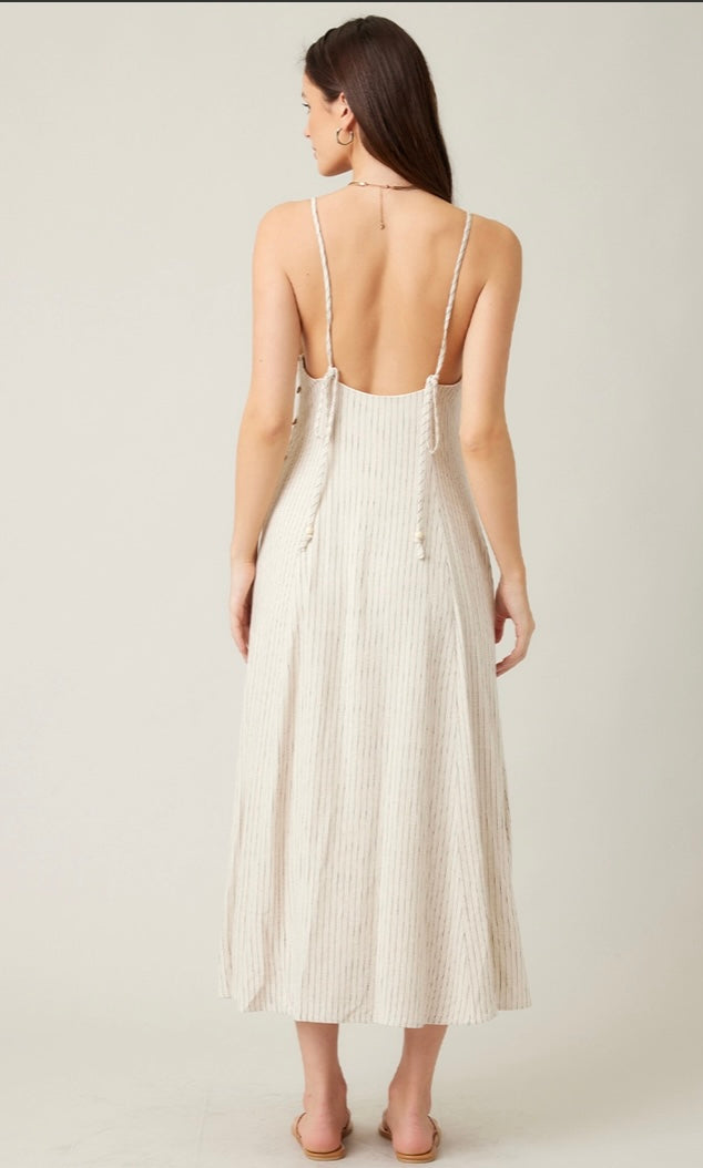 Midi dress features woven material with striped print, tank straps with adjustable back, button side accents, side pockets, and v neckline. Fully lined. Rayon/Linen blend