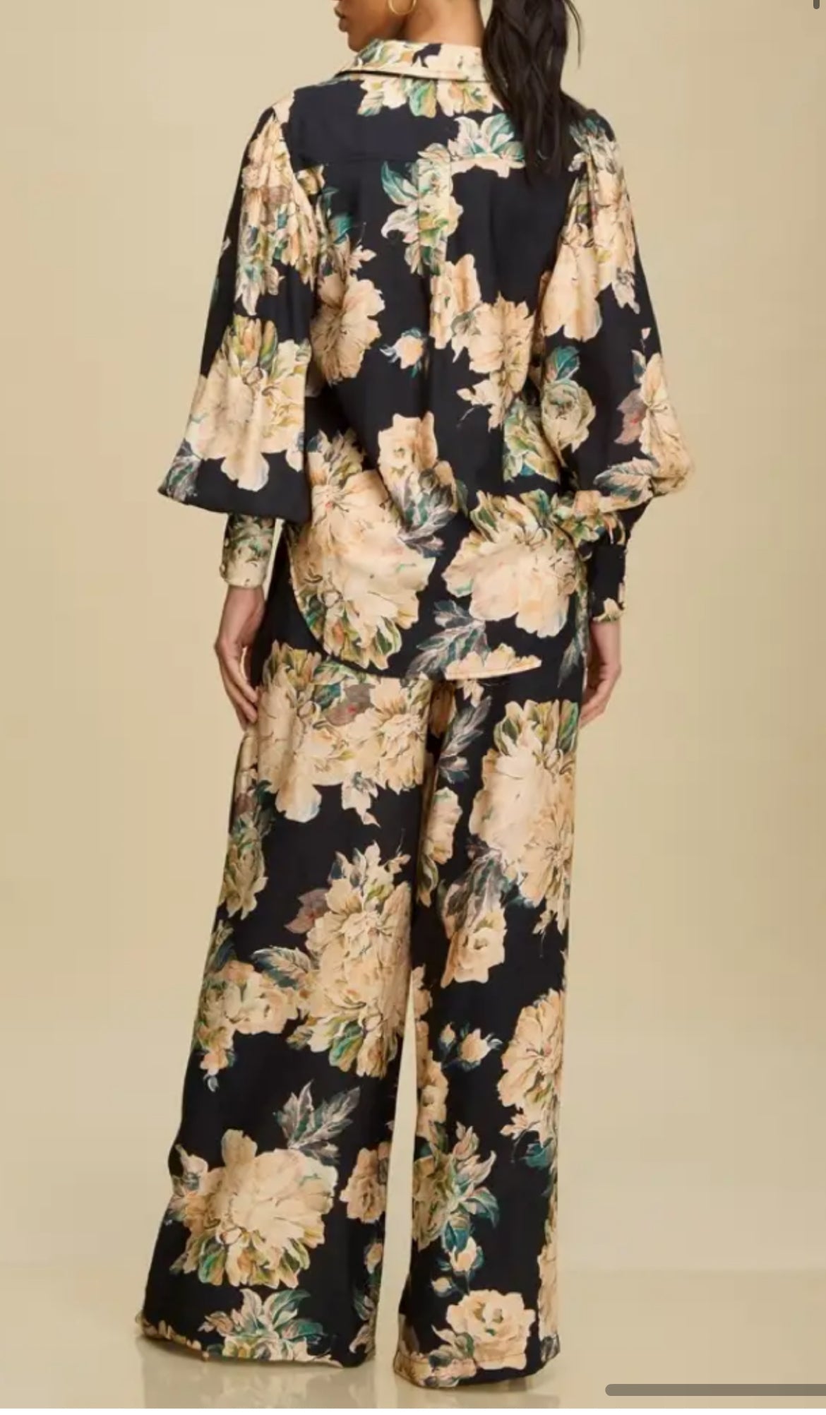 Vintage floral print blouse features button down front and puff sleeve style. Matching pants available in separate listing. Rayon/Nylon blend