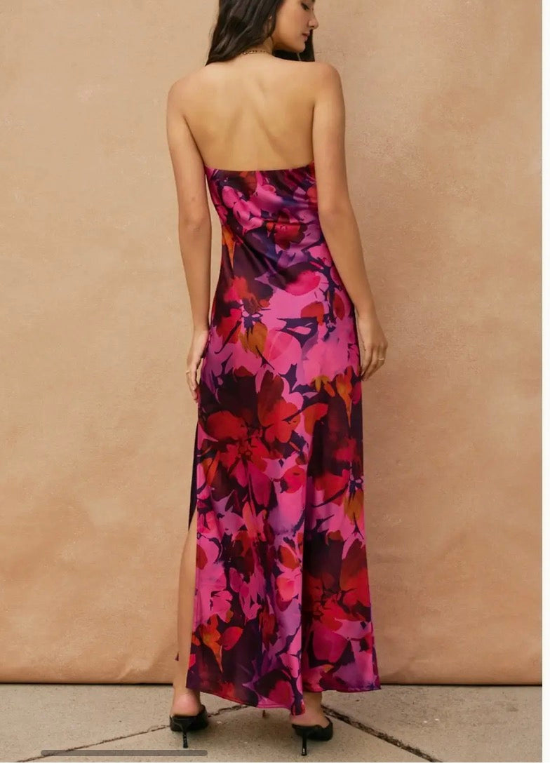 Strapless maxi dress features flocal print, pull on style , gel grip to keep top in place, and side slit. Fully lined 100% Polyester